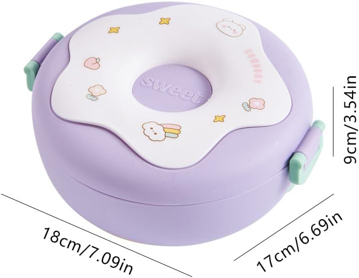 · Dona Temática y Tierno Glaseado: La lonchera está diseñada para replicar la forma de una dona, con una tapa que simula el glaseado decorado con motivos dulces y adorables, como osos, nubes, arcoíris y estrellas. Incluso lleva las palabras "SWEET" y "GOOD DAY" grabadas en la tapa, reforzando su estilo tierno.