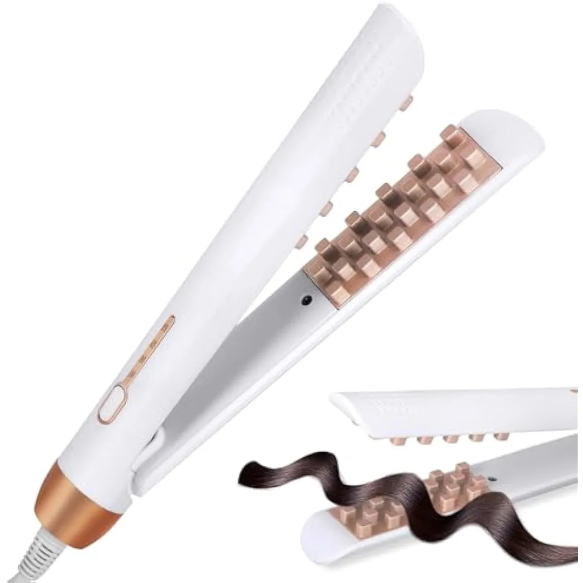 Placas con Peine (o Guías): Las placas externas están equipadas con una serie de "peines" o guías en relieve (los cuadrados que se ven) que ayudan a envolver el mechón de cabello y darle forma de rizo mientras deslizas la herramienta. Estas guías, a veces llamadas "barriles rizadores", aseguran que el cabello se curve de manera uniforme y duradera.