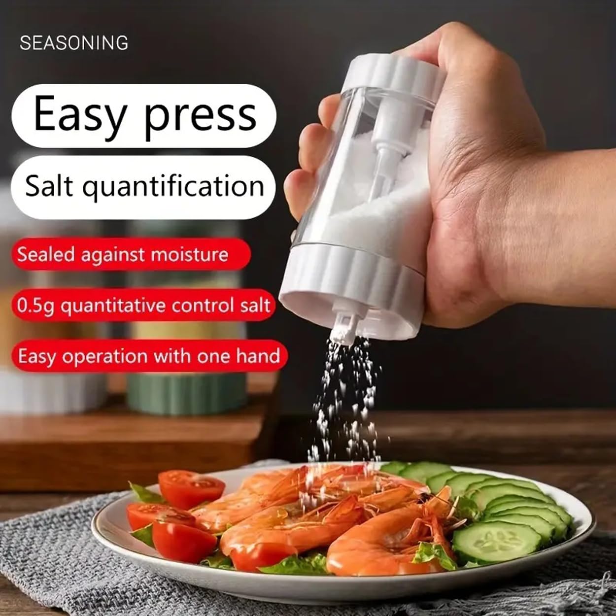 Este es un dispensador de especias compacto y transparente, específicamente diseñado para dispensar condimentos finos, como la sal refinada, de manera uniforme y, lo más importante, protegido de la humedad.