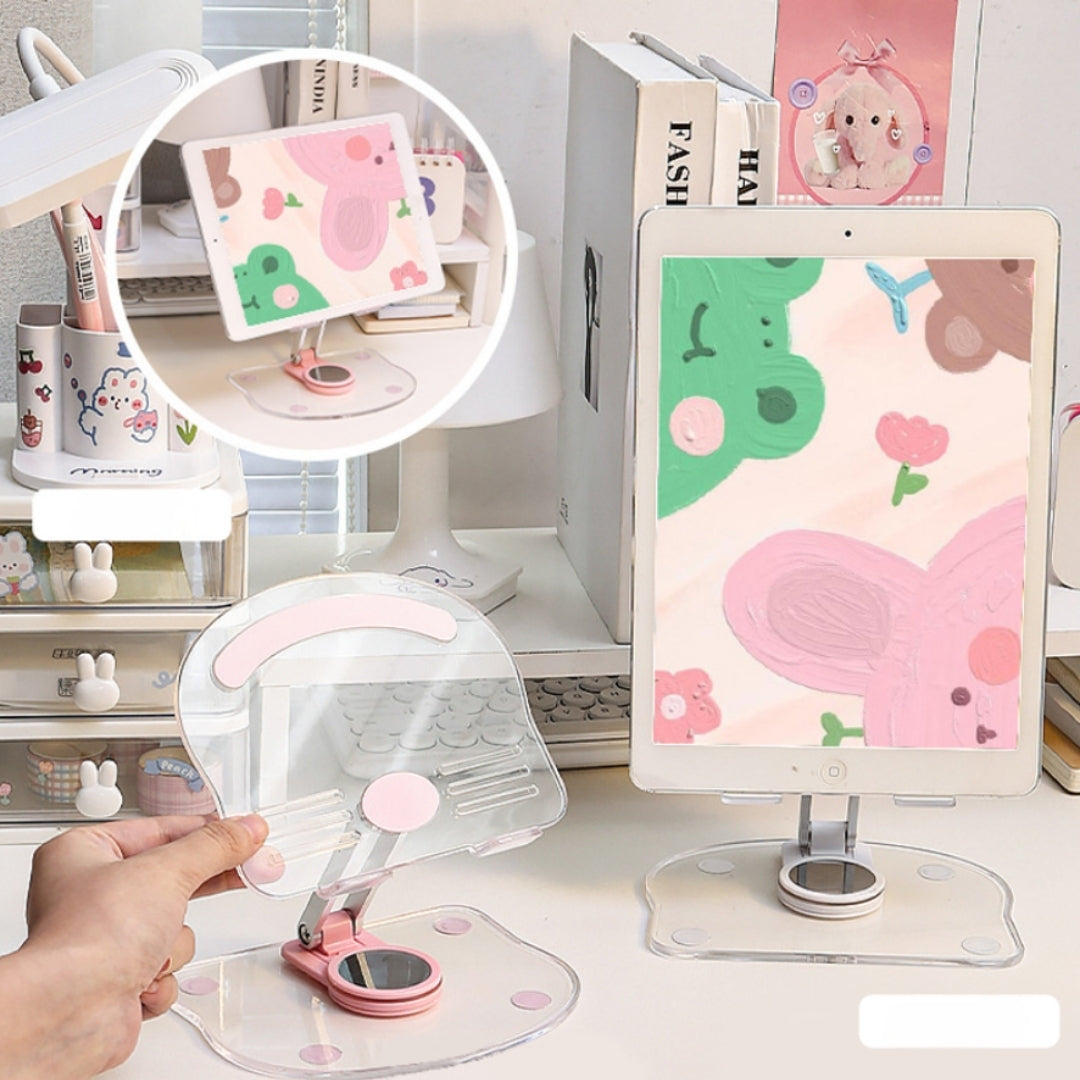 Mejora tu postura y tu productividad con este soporte de escritorio premium. Este Soporte Giratorio Ajustable combina funcionalidad y un diseño adorable (con detalles de color rosa y elementos decorativos), ideal para estudiantes, artistas y profesionales que usan tabletas o iPads.